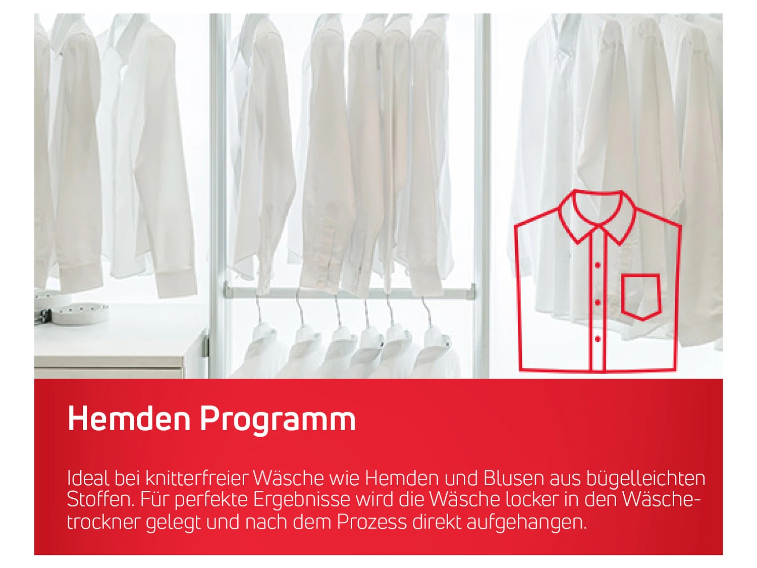 Baumwolle Extratrocken, Baumwolle Schranktrocken, Baumwolle Bügeltrocken, Feinwäsche, Synthetik Extratrocken, Synthetik Schranktrocken, Synthetik Bügeltrocken, Wolle, Zeitprogramm- Warm, – Kühl, – Lüften, Hemden, Sport, Mix, Spezial, Individuell