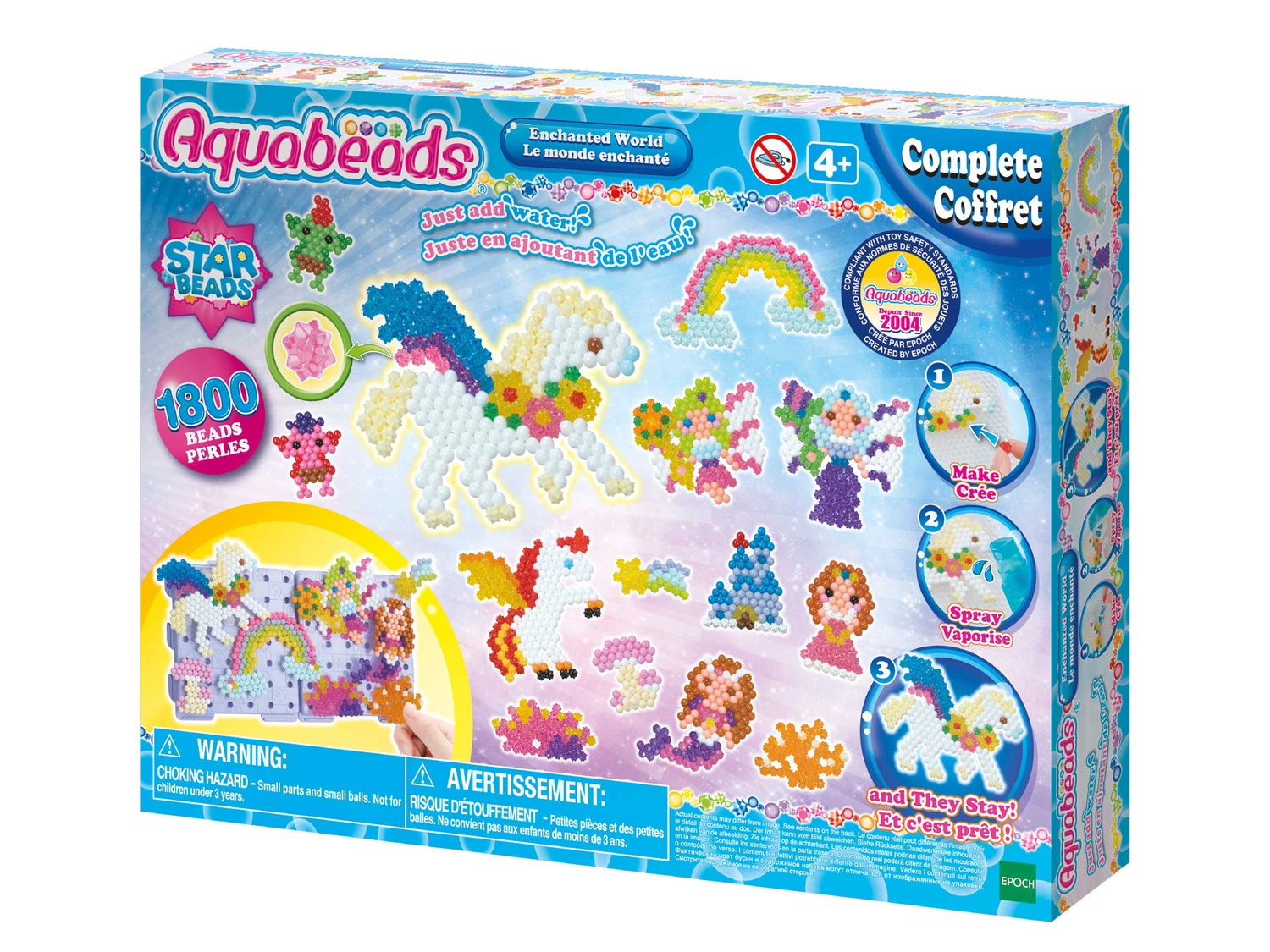 Verzauberte Welt bei Aquabeads. Aquabeads das Original seit 2004! In der märchenhaften Zauberwelt gibt es Einhörner, Zauberer, Feen, kleine Kobolde und vieles mehr, was aus den bunten Bastelperlen kreiert werden kann. Nach dem Trocknen werden die Perlenbilder auf dem neuen Kreationen Dekorationsdisplay aufgesteckt und können so toll in dem Kinderzimmer dekoriert werden. Im Aquabeads Zauberwelt Bastelset sind über 1.500 bunte Bastelperlen, zwei Kreationen Dekorationsplatten, eine Bastelplatte, ein Sprüher, eine Spielszenerie und Motiv-Vorlagen enthalten. Für Kinder ab 4 Jahren geeignet.