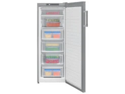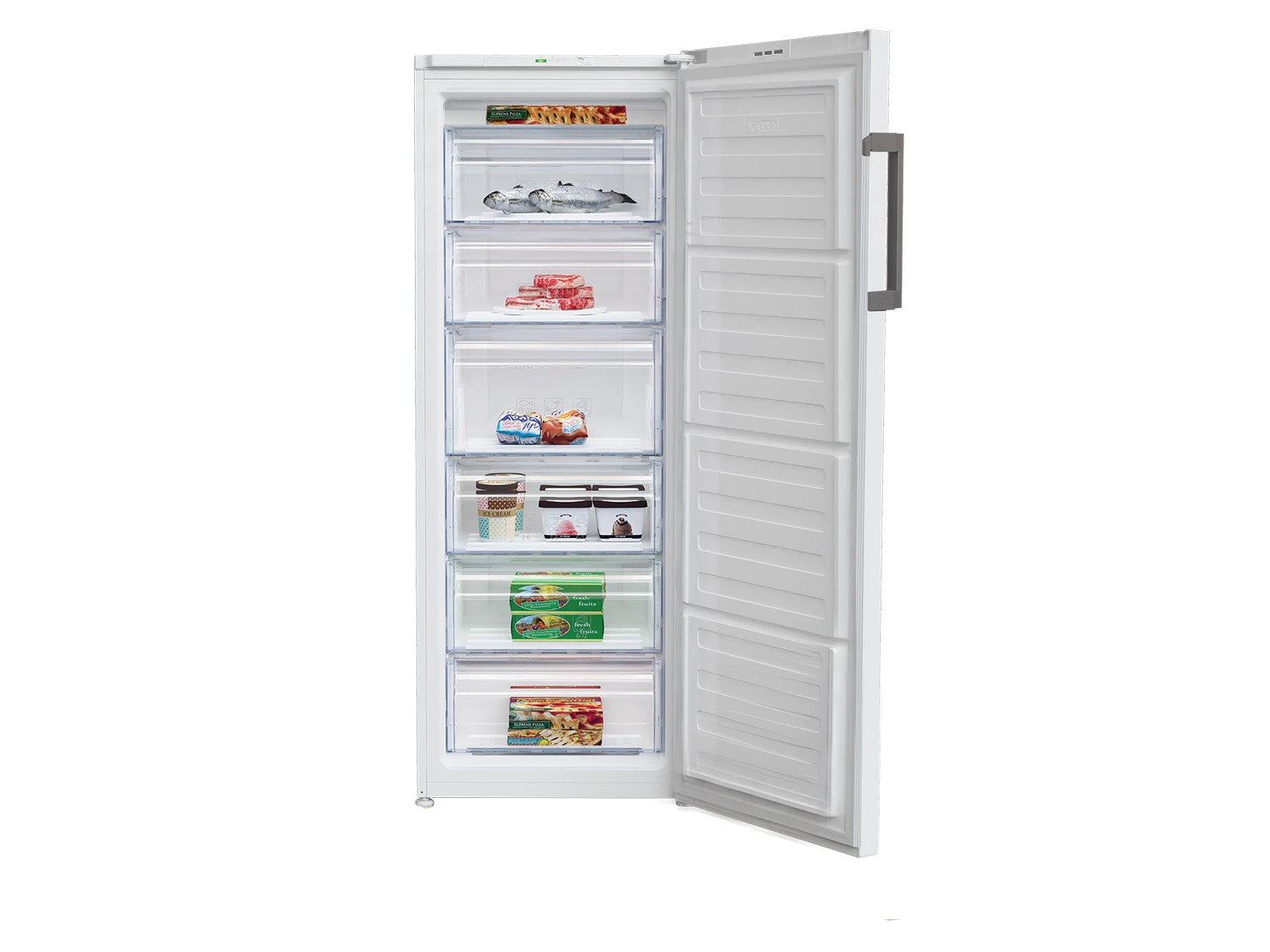 Der Gefrierschrank RFSA240M43WN bietet optimalen Stauraum für Ihre Lebensmittel. Die 215 Liter Nutzinhalt verteilen sich auf 6 Schubladen mit transparenter Front, damit Sie immer den Überblick behalten. Die Steuerung erfolgt über das innenliegende Bedienfeld, das sogar eine Schnellgefrierfunktion anbietet, um den großen Wocheneinkauf schneller auf die Gefriertemperatur zu bringen. In der Tür befindet sich zudem eine Statusanzeige, so dass Se sofort sehen, ob das Gerät ordnungsgemäß funktioniert. Alle Beko Gefriertruhen und Gefrierschränke verfügen über ein fortschrittliches, elektronisches Temperaturregelungssystem. Während andere Geräte nicht mehr funktionieren, wenn die Umgebungstemperatur sinkt, halten Beko Geräte den Betrieb bei einer Umgebungstemperatur bis -15°C aufrecht. So können Sie das Gerät beispielsweise in einer Garage oder einem anderen unbeheizten Raum aufstellen, ohne dass die eingelagerten Lebensmittel verderben. Und all das bei Energieeffizienzklasse E.