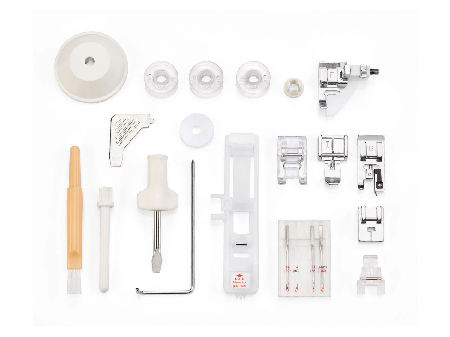 Enthaltenes Zubehör: 1x Allzweck-Nähfuß, 1x Standardreißverschlussfuß, 1x Reißverschlussfuß nahtverdeckt, 1x Knopflochfuß, 1x Knopfannähfuß, 1x Kantenumnähfuß, 1x Blindsaumfuß, 1x Satinstichfuß, 1x Kanten-/Quiltführung, 4x Spule, 1x L-Schraubendreher, 1x Schmetterlingsschraubendreher, 1x zweiter Garnrollenstift, 1x Garnrollenkappe (groß), 1x Garnrollenkappe (klein), 1x Filzkissen, 1x Reinigungspinsel/Nahttrenner, 4x einzelne Nadel, 1x Staubschutzhülle, 1x Fußanlasser, 1x Netzkabel