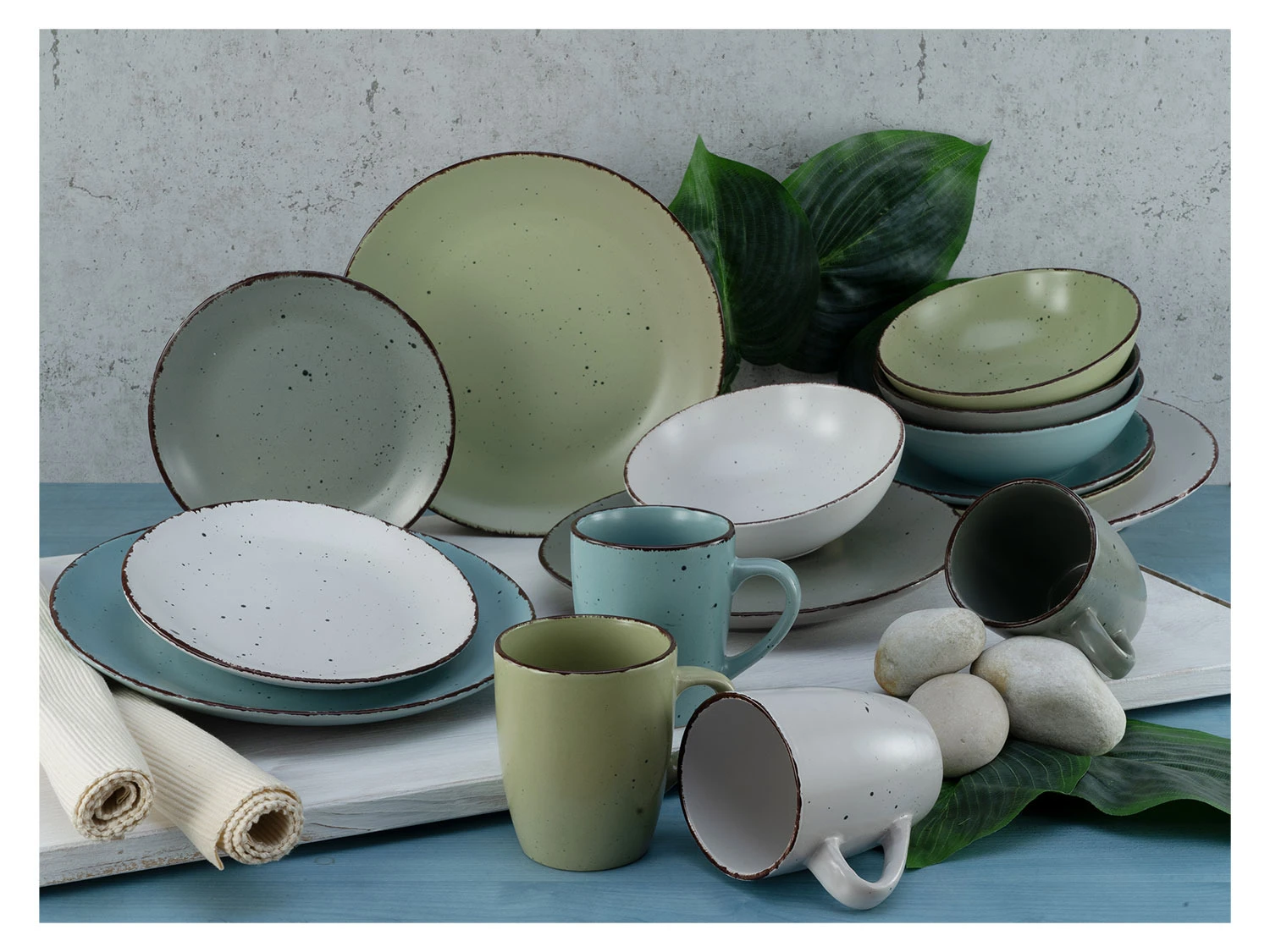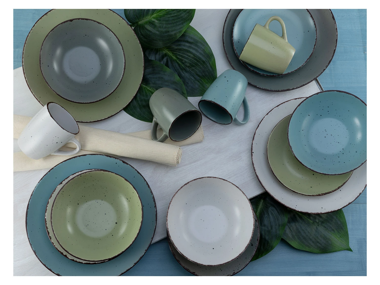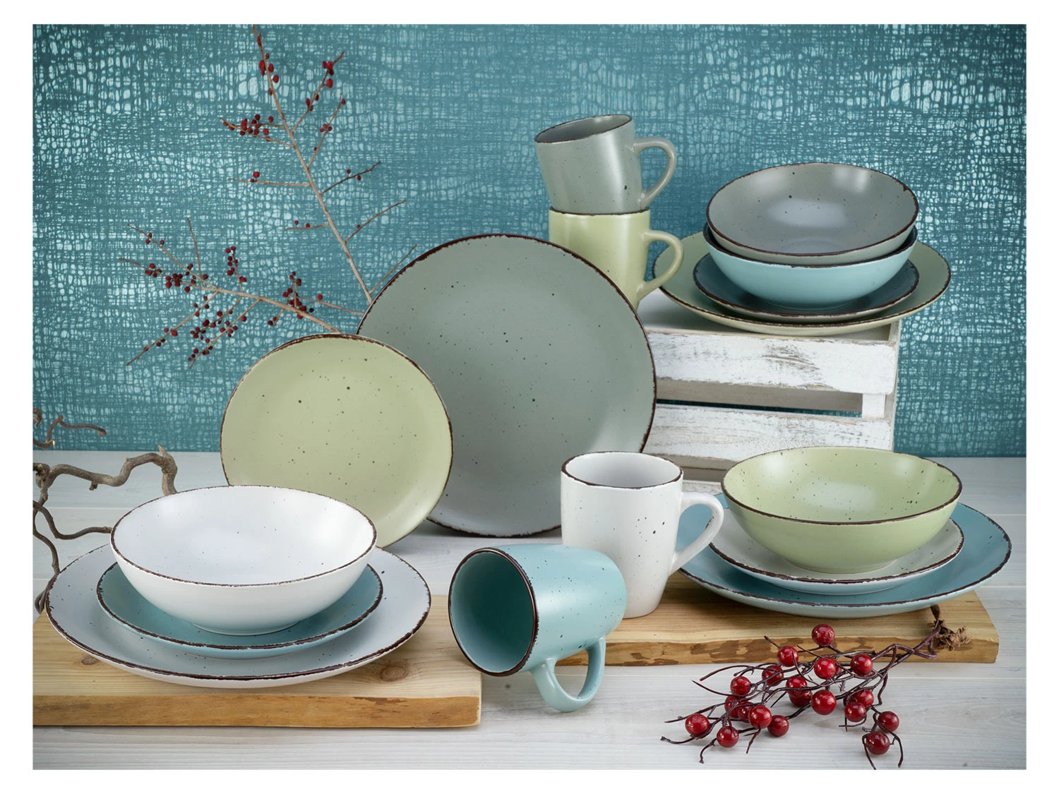 Das Geschirr präsentiert sich in einer eleganten Coupeform mit handgemalten Rändern und Sprenkeln im modernen Vintage Look. Die seidenmatte Glasur verleiht dem Service einen edlen und hochwertigen Touch in den Farben Türkisblau, Mintgrün, Stein und Cremeweiss. Echtes Highlight auf dem gedeckten Tisch!