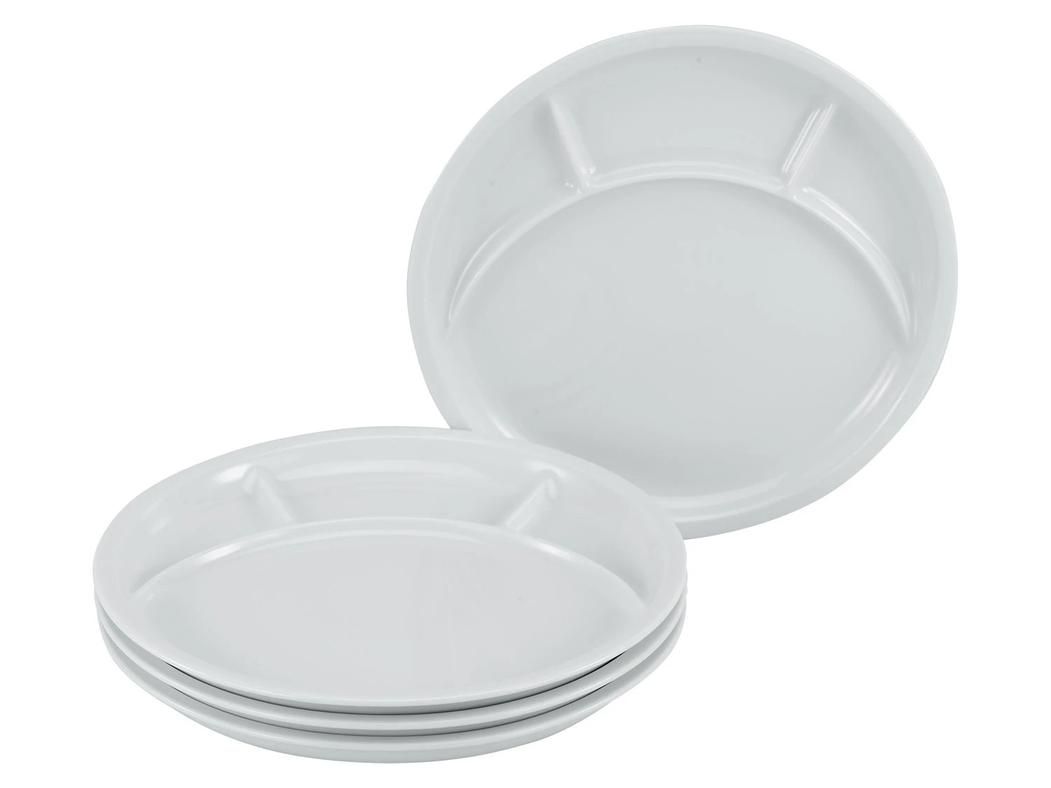 Sie erhalten hier ein 4 teiliges Fonduetellerset (je 27 cm) aus hochwertiger europäischer Porzellanproduktion. Dieser Klassiker in Hotel Qualität präsentiert sich in einem strahlenden Weiss. Universell einsetzbar für Fondue, Raclette, Barbecue, Grillparty, Antipasti, Asia Food und vieles mehr. Das Tellerset ist platzsparend stapelbar und gehört in jeden Haushalt!