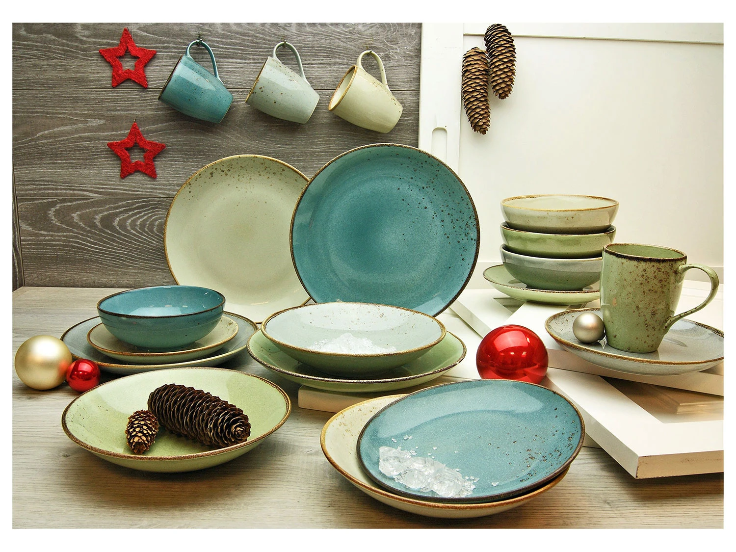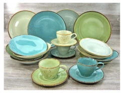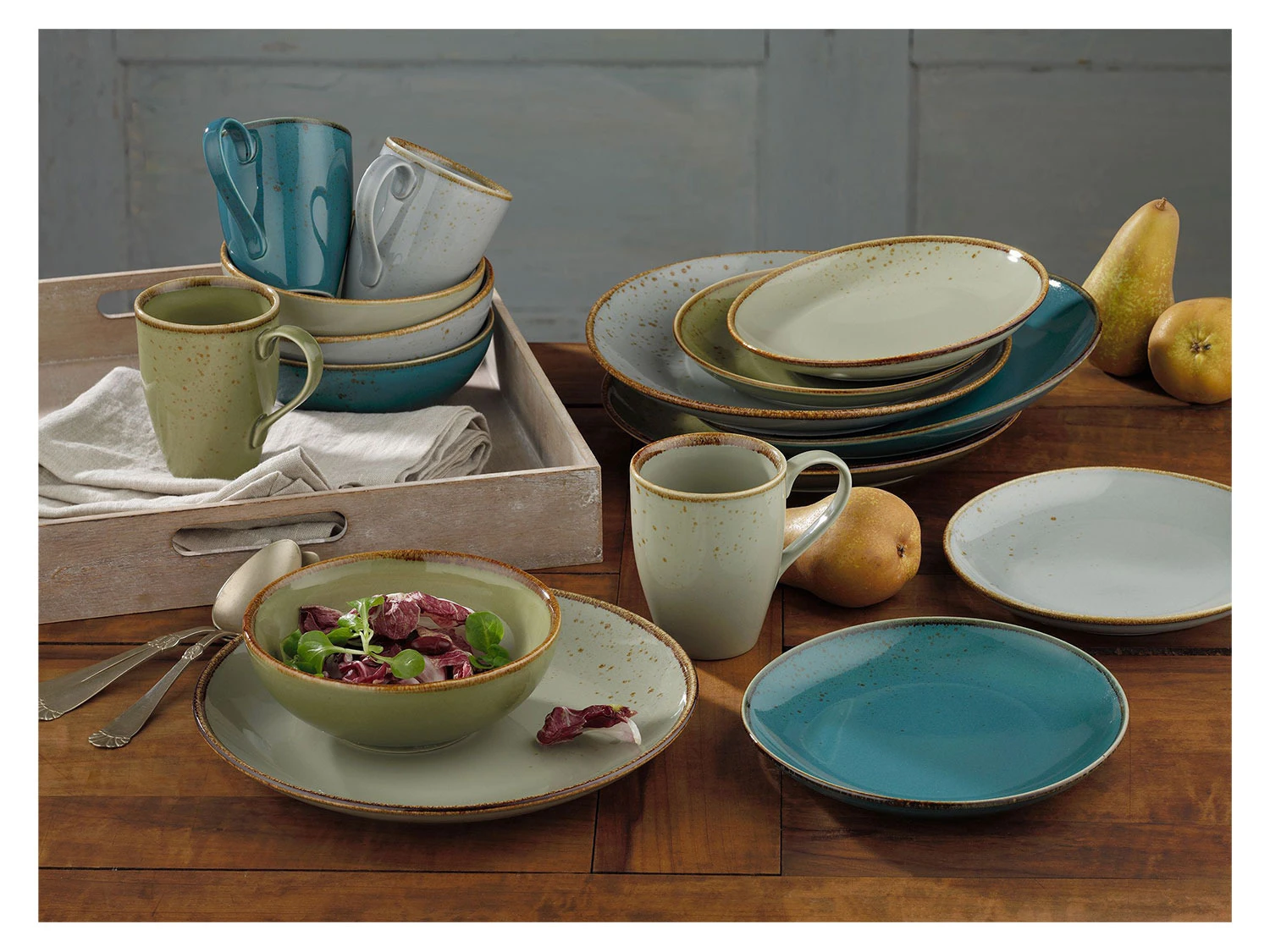 Das hochwertige Steinzeug präsentiert sich in einer hochaktuellen Coupeform mit sortierten Naturglasuren. Die 4 Naturfarben Steingrau, Wasserblau, Naturgrün und Sand erinnern an die 4 Elemente Stein, Wasser, Flora und Erde.