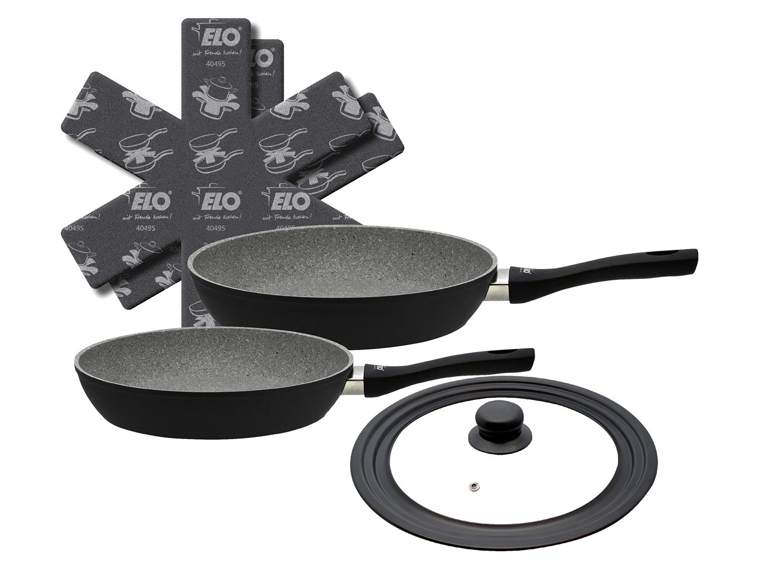 Bratpfannen aus geschmiedetem Aluminium. Innen mit einer langlebigen marmorierten 2-lagigen Antihaftversiegelung. Außen schwarz beschichtet. Der schwarze Kunststoffstiel ist mit einem Flammenschutz versehen. Die Pfannen sind energiesparend und pflegeleicht. Die Pfannenschoner schützen beim Stapeln Ihrer Pfannen vor Beschädigungen. Der Universalglasdeckel ist durch die Antihaftversiegelung besonders leicht zu reinigen. Glasdeckel ist mit einem Entlüftungsloch ausgestattet. Die Pfannen und der Deckel ist spülmaschinengeeignet. Pfannen sind für alle Herdarten, auch für Induktion geeignet. Pfannenset bestehend aus: je 1 x Pfanne 24 und 28 cm ,2 Pfannenschoner, 1 x Universaldeckel passend für Artikel mit einem Durchmesser von 24/26/28 cm