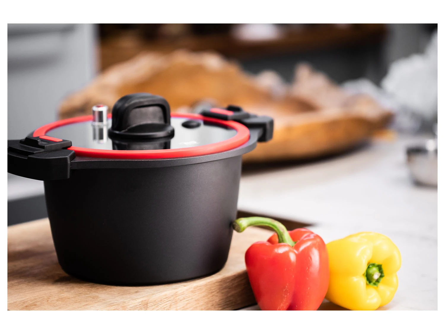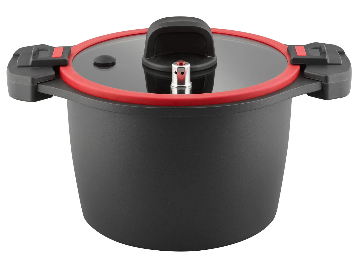 - Flacher, stoßfester Glasdeckel mit Silikonrand, Kunststoffgriff und Dampfablassventil