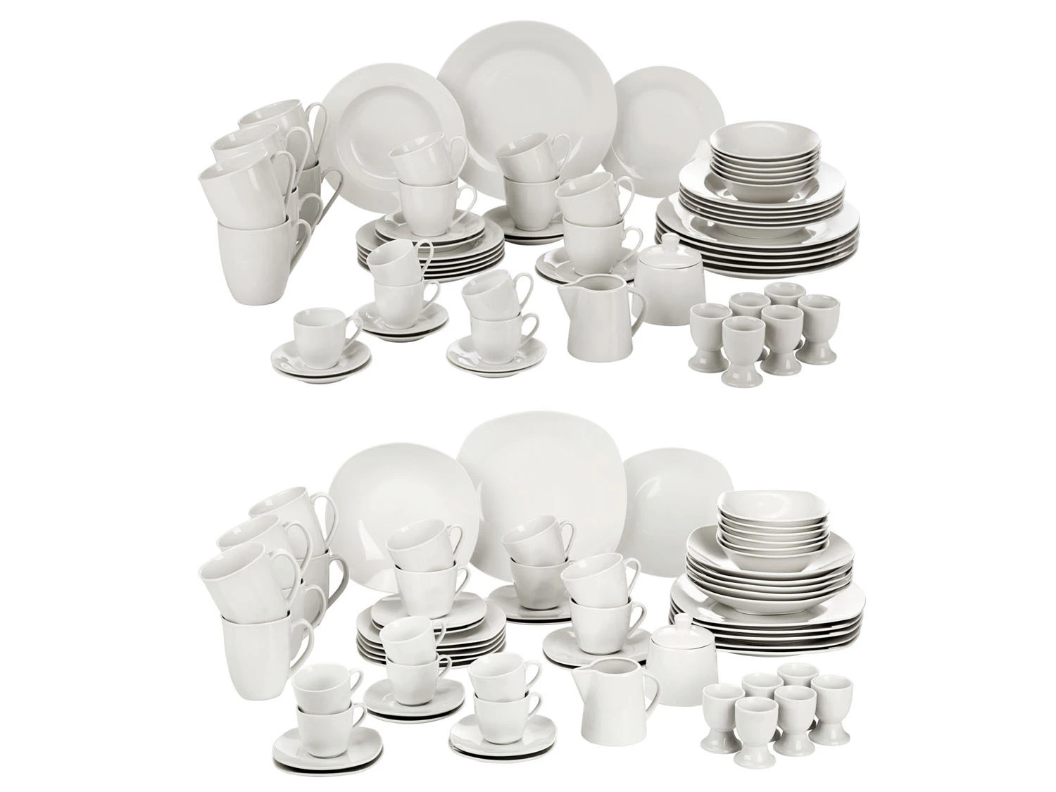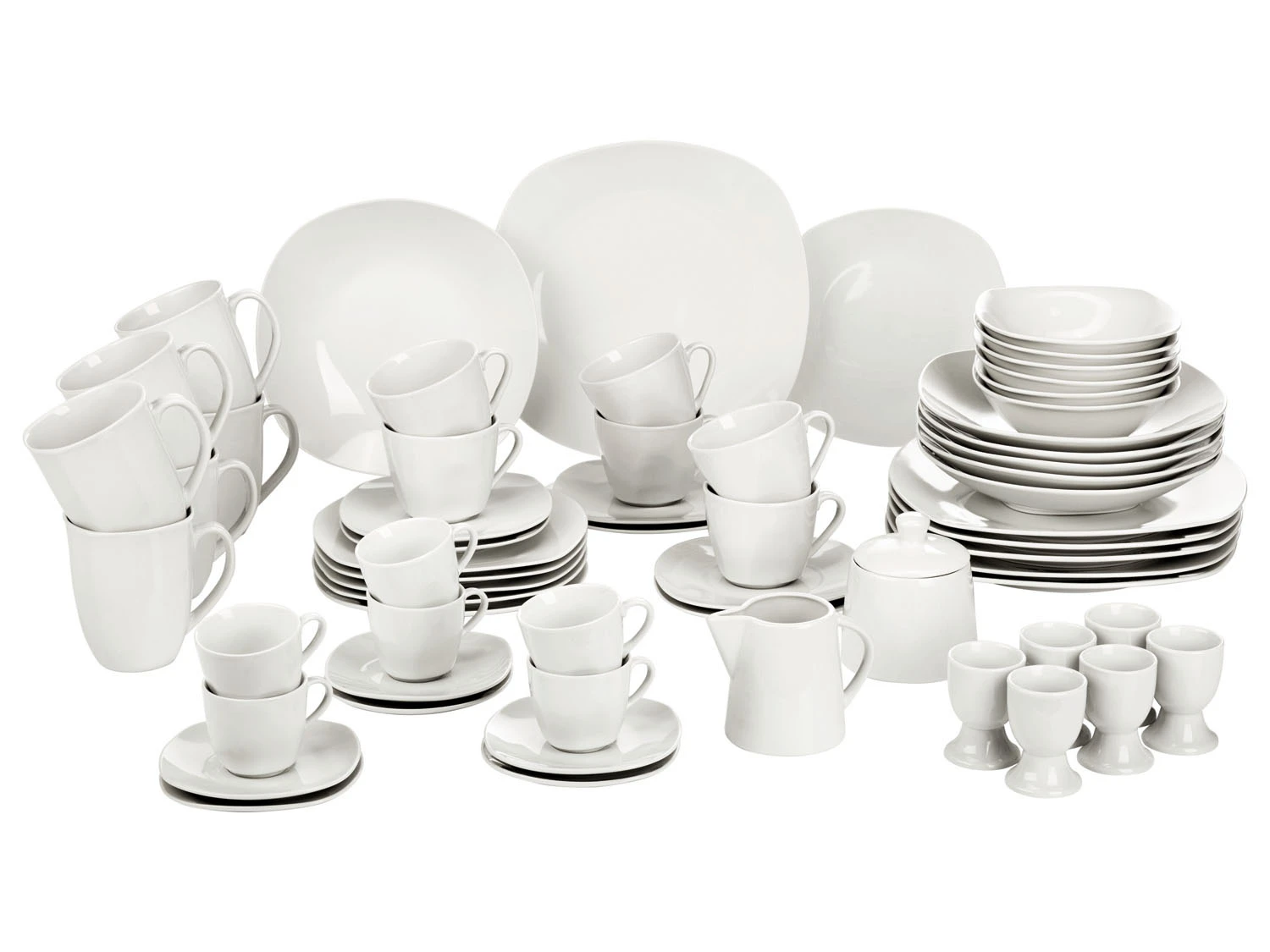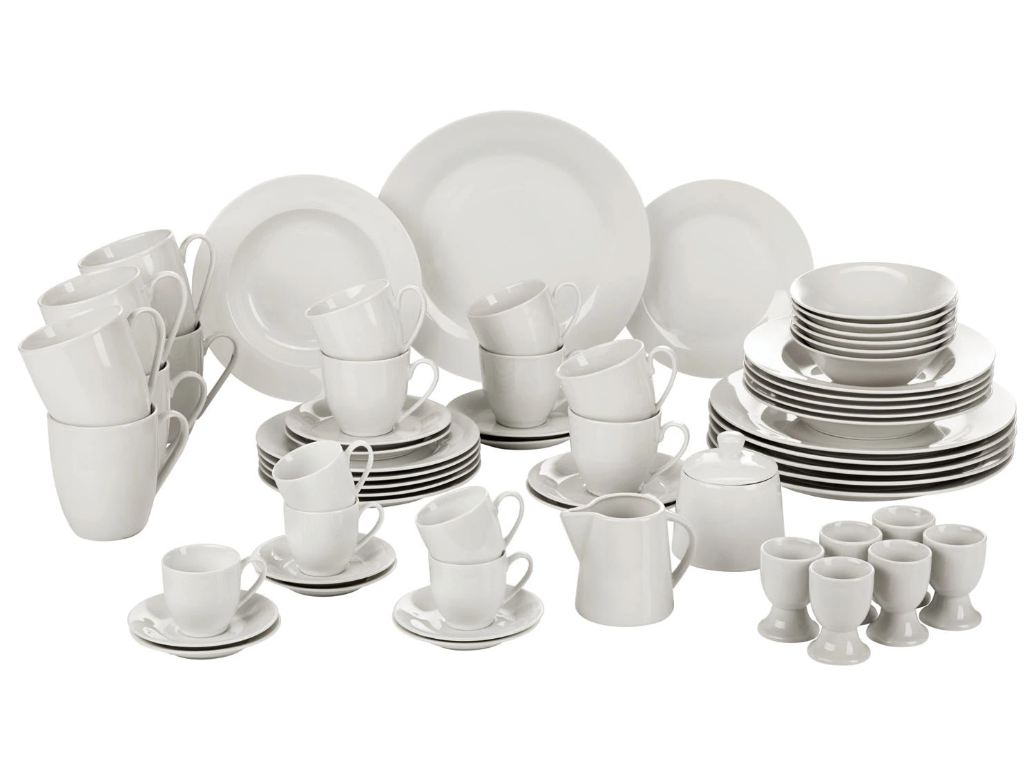 6x Teller / 6x Suppenteller / 6x Dessertteller / 6x Kaffeetasse / 6x Kaffeeuntertasse / 6x Espressotasse / 6x Espressountertasse / 6x Frühstücksschale / 6x Kaffeebecher / 6x Eierbecher / 1x Zuckerdose mit Deckel / 1x Milchkännchen