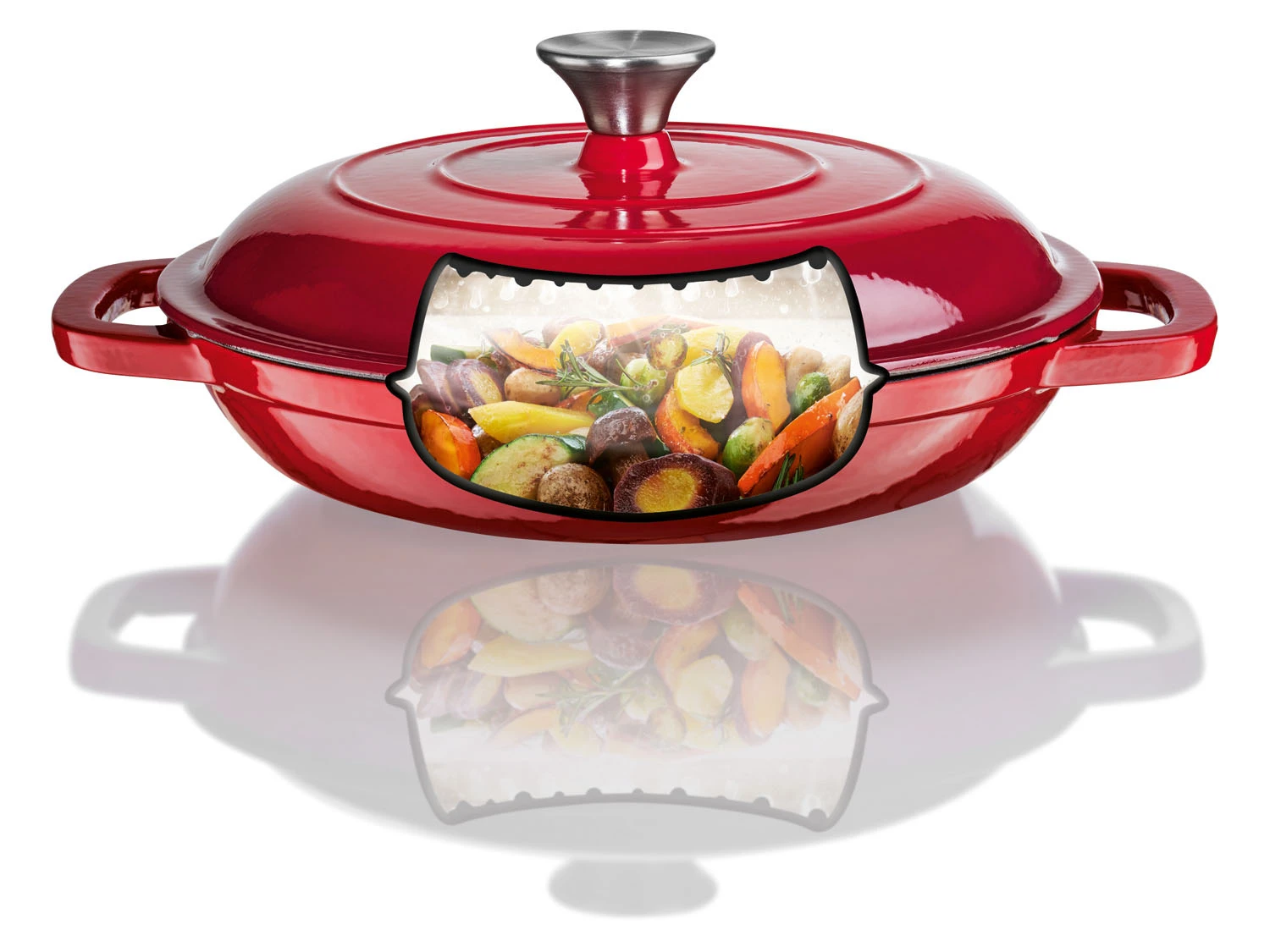 Durch die Noppen auf der Unterseite des Deckels entsteht beim Kochen ein Kreislauf innerhalb des Kochgeschirrs. Der aufsteigende Dampf kondensiert am Deckel und wird durch die Noppen gleichmäßig auf das Gargut verteilt.