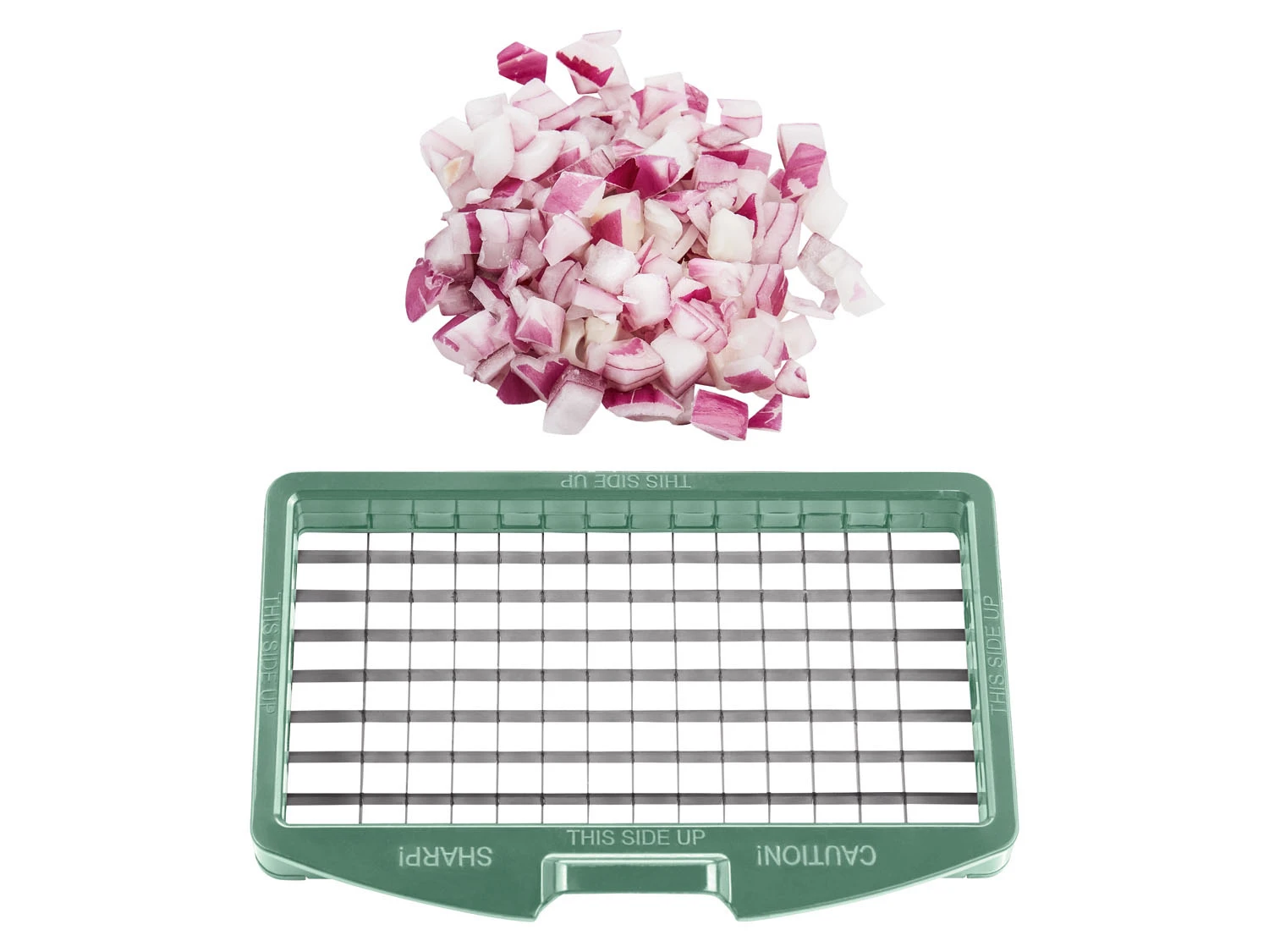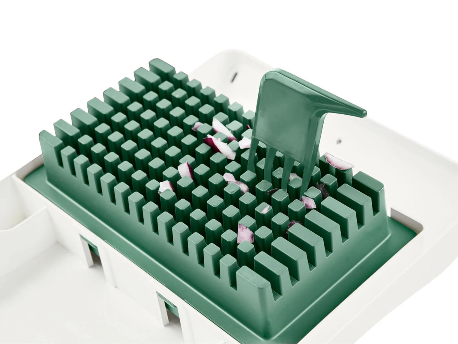 - Mit 6 Einsätzen: Würfelschneider fein, Würfelschneider grob, grobe Reibe, feine Reibe, Hobel und Julienne-Einsatz