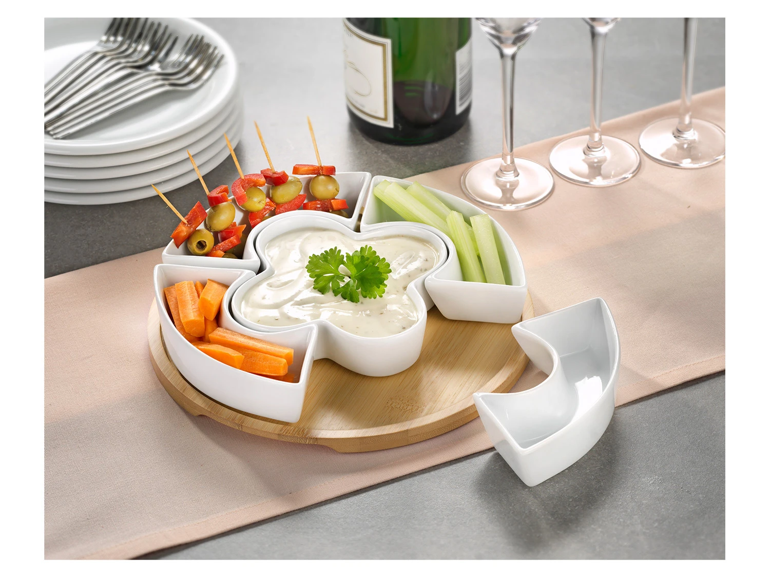 - 5 tlg. Schalenset in Blumenform mit Bambustablet.
