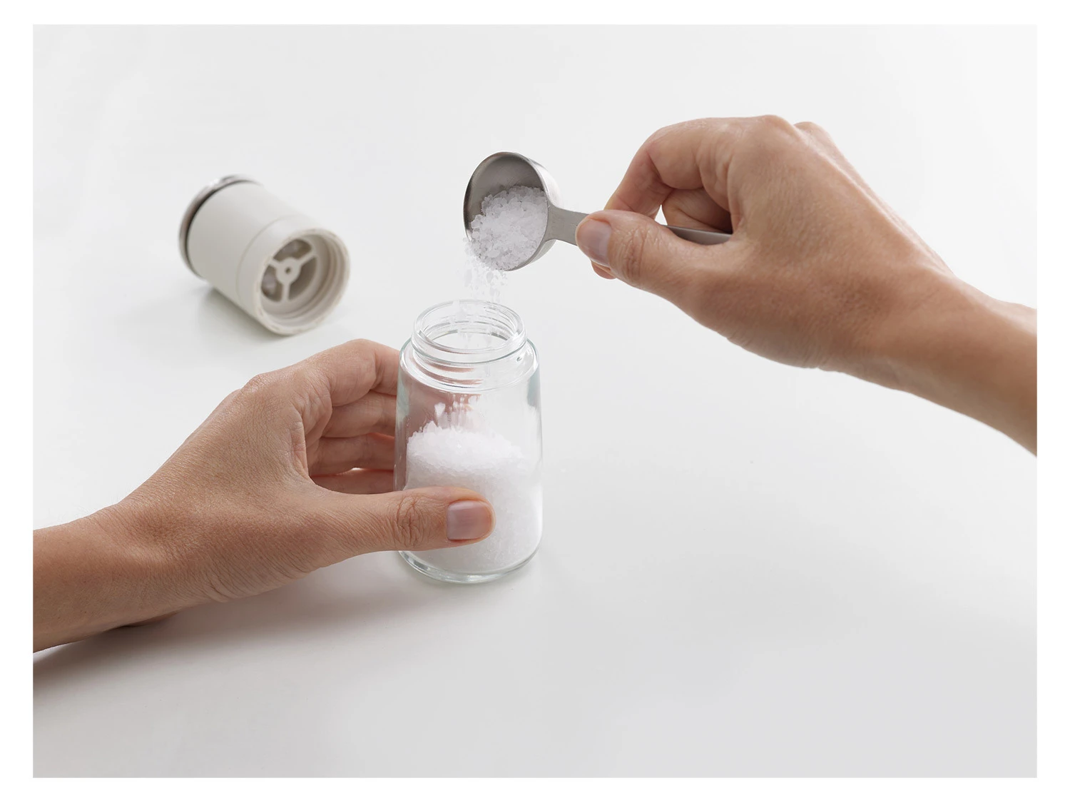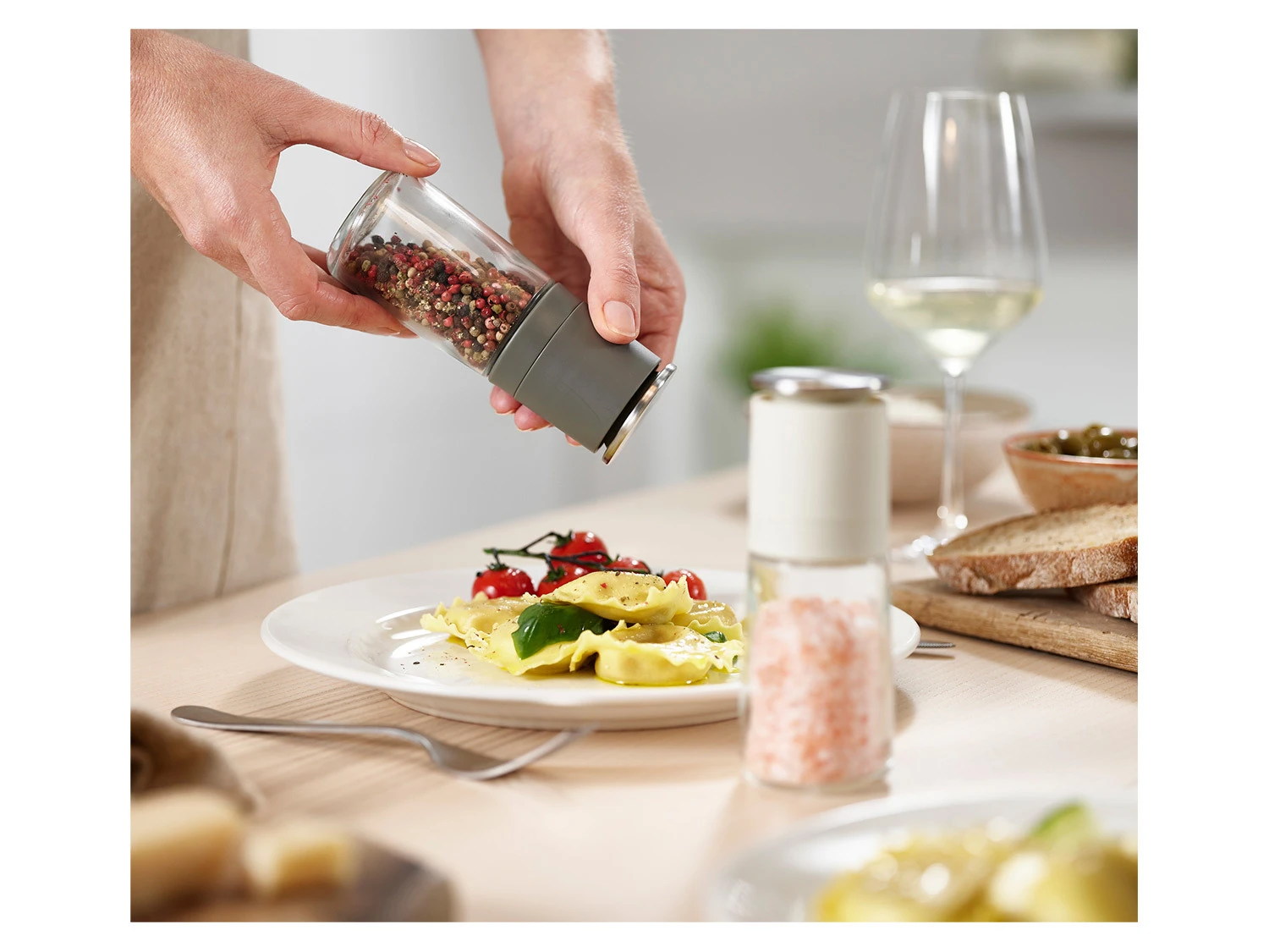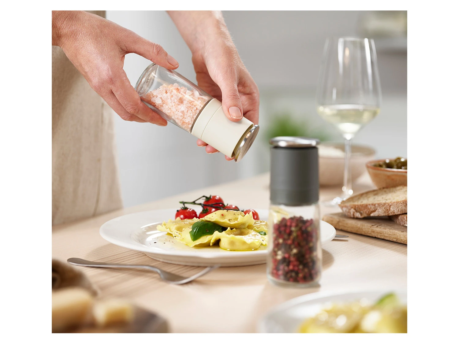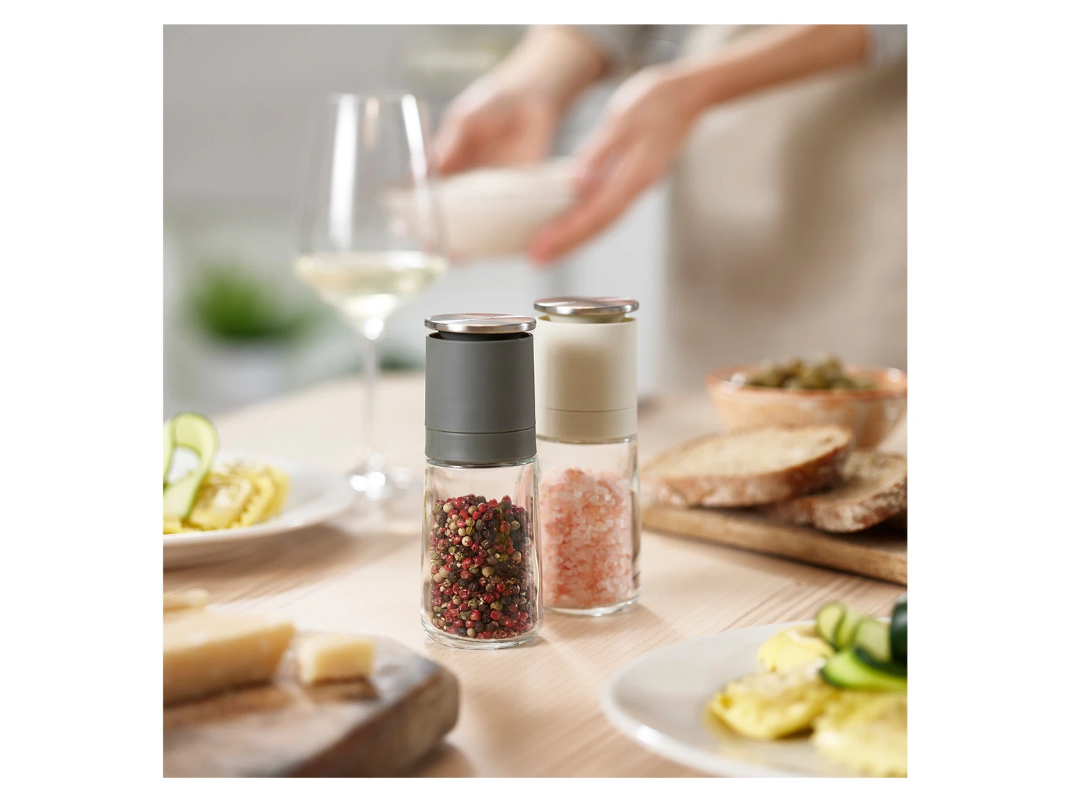 Ein Salz- und Pfeffermühlen-Set, bei dem sich das Mahlwerk oben befindet. So fällt überschüssiges Mahlgut beim Abstellen in die Mühle zurück.