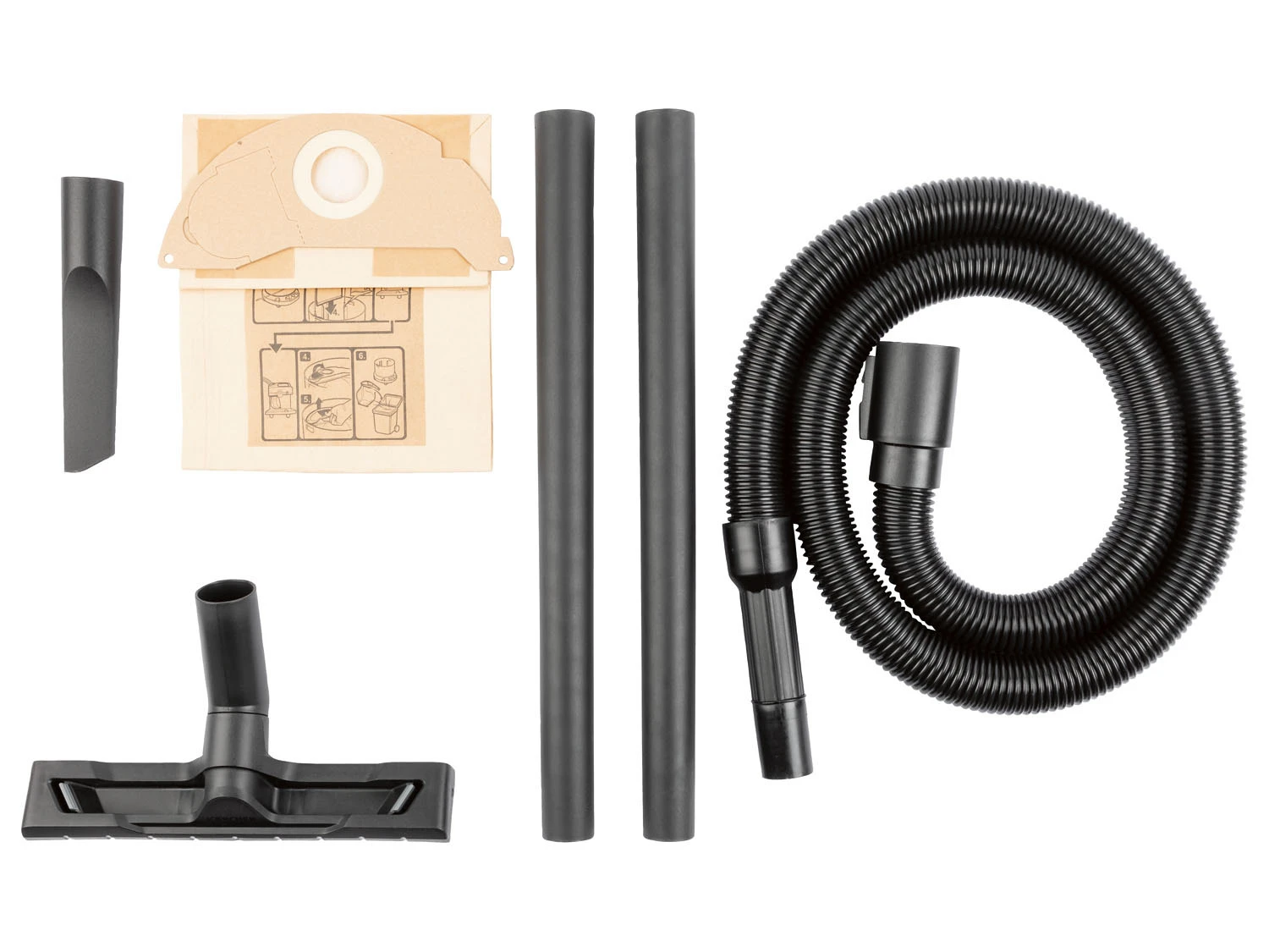Enthaltenes Zubehör: Nass- und Trockensaugdüse, Fugendüse, Schaumstofffilter, 1 Staubsaugerbeutel, Saugschlauch 1,9 m x 35 mm, 2x Saugrohr Kunststoff 0,5 m x 35 mm