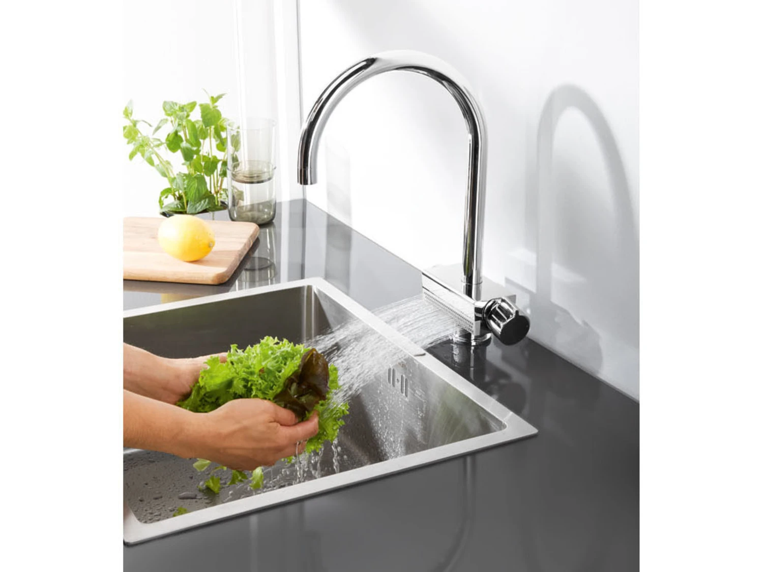 - Mit extra breiter Brause zum Abwaschen von empfindlichen Lebensmitteln, Abspülen von Backblechen, Auflaufformen etc.