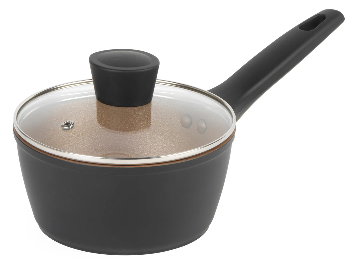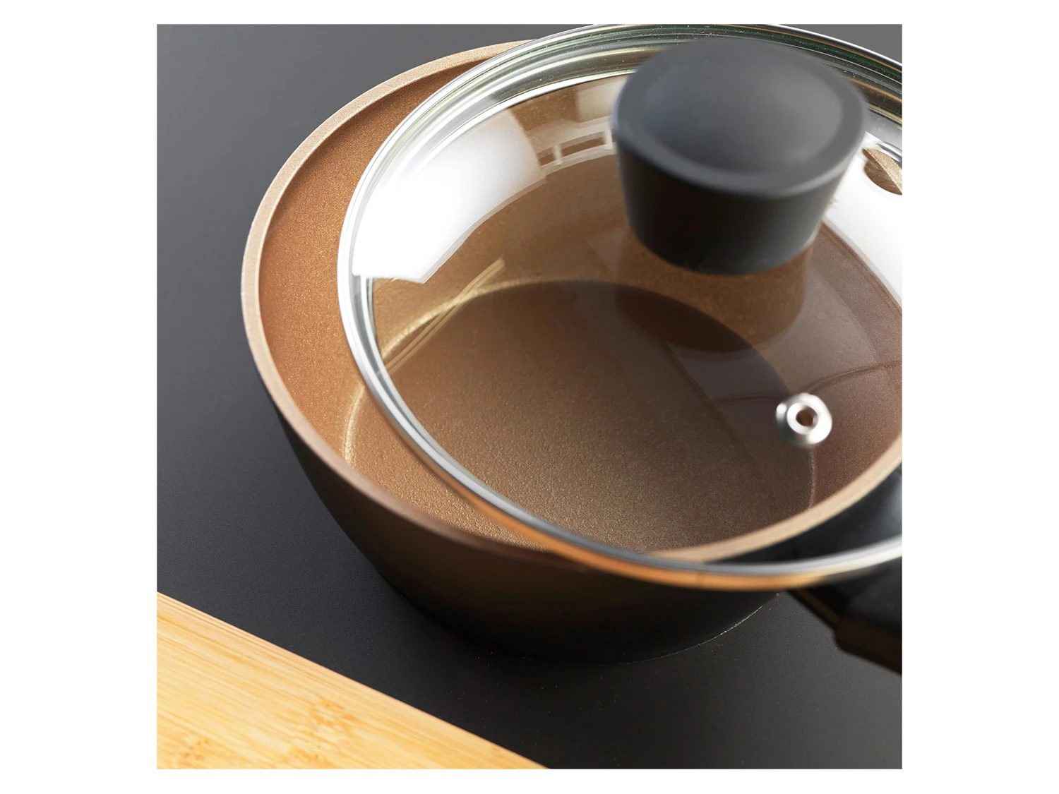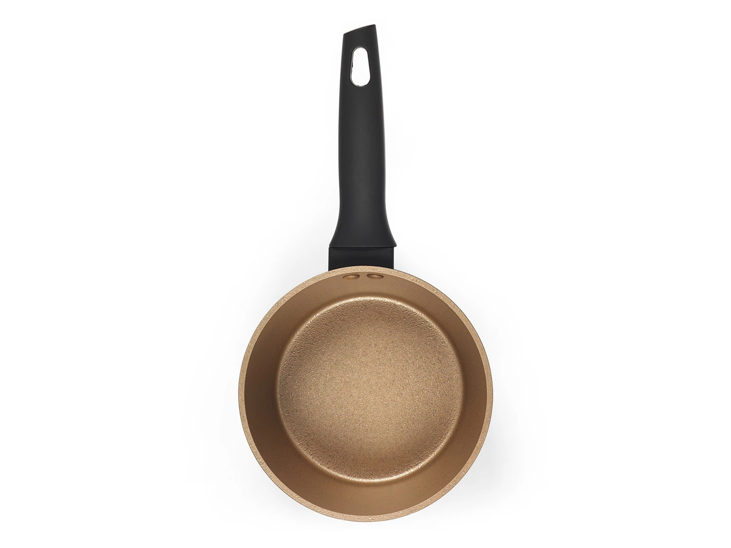 - Diese stilvolle Stielkasserolle ist aus robustem, geschmiedetem Aluminium gefertigt und besitzt eine goldene Crystaltech-Antihaft-Innenbeschichtung.