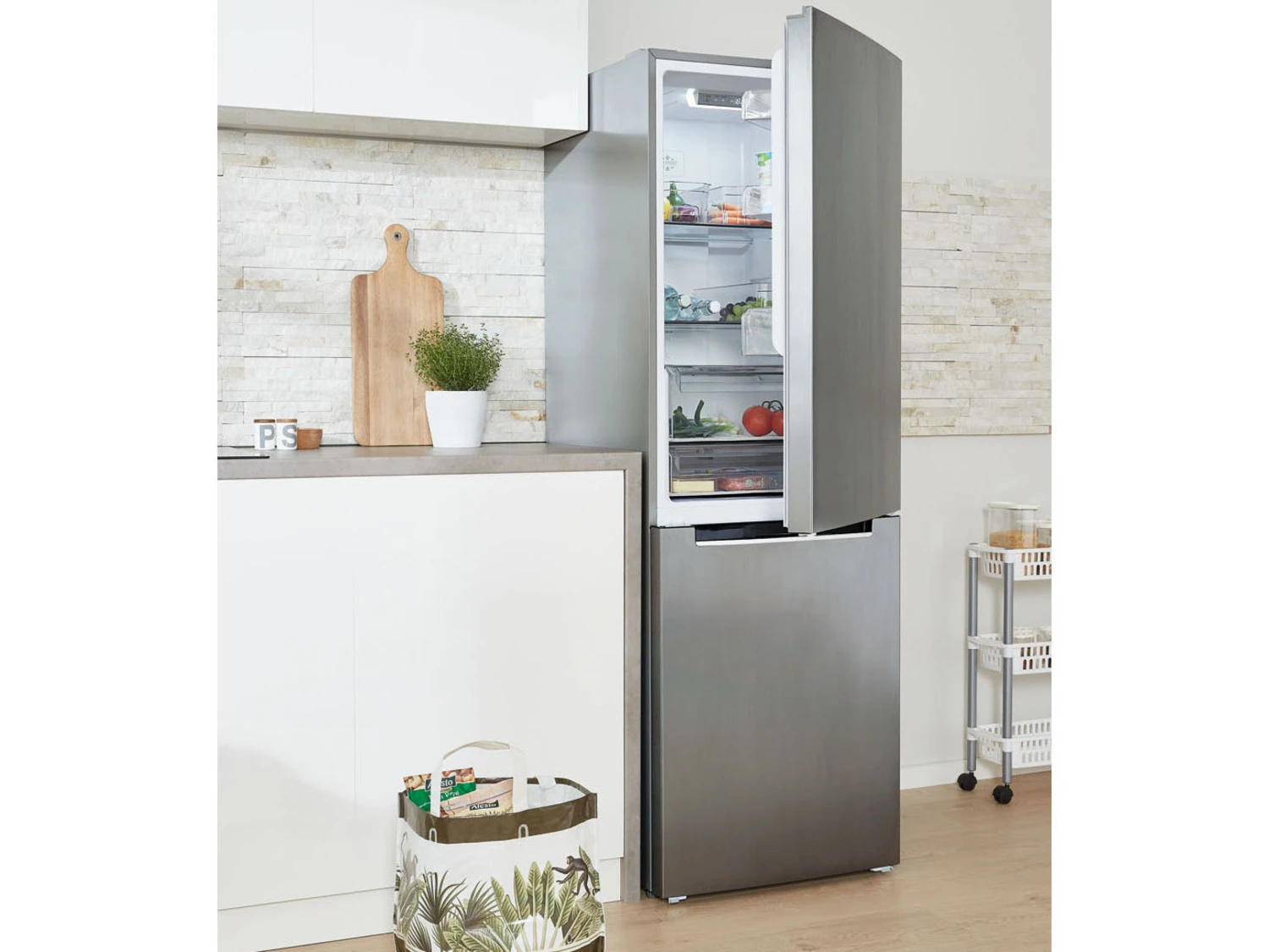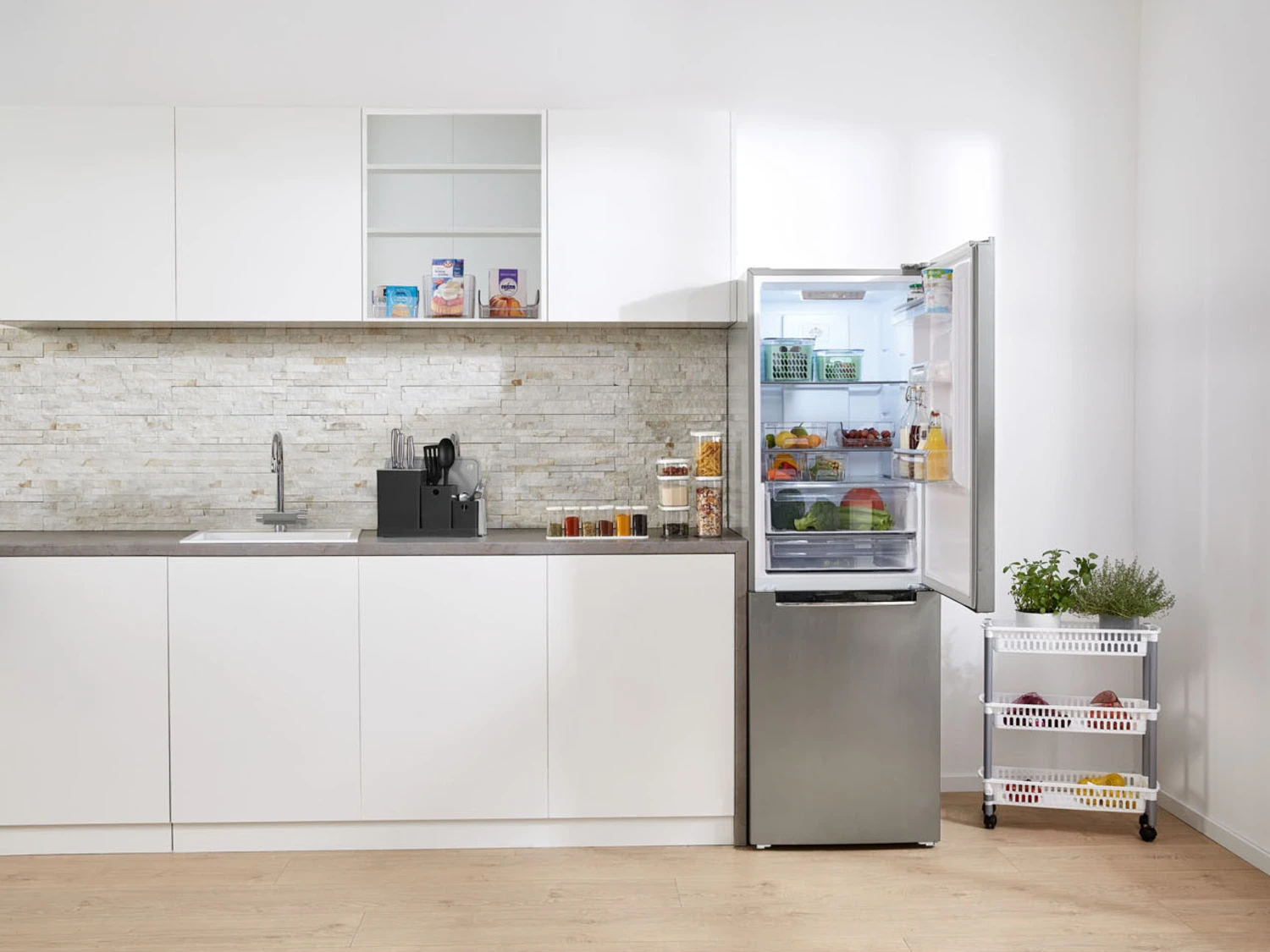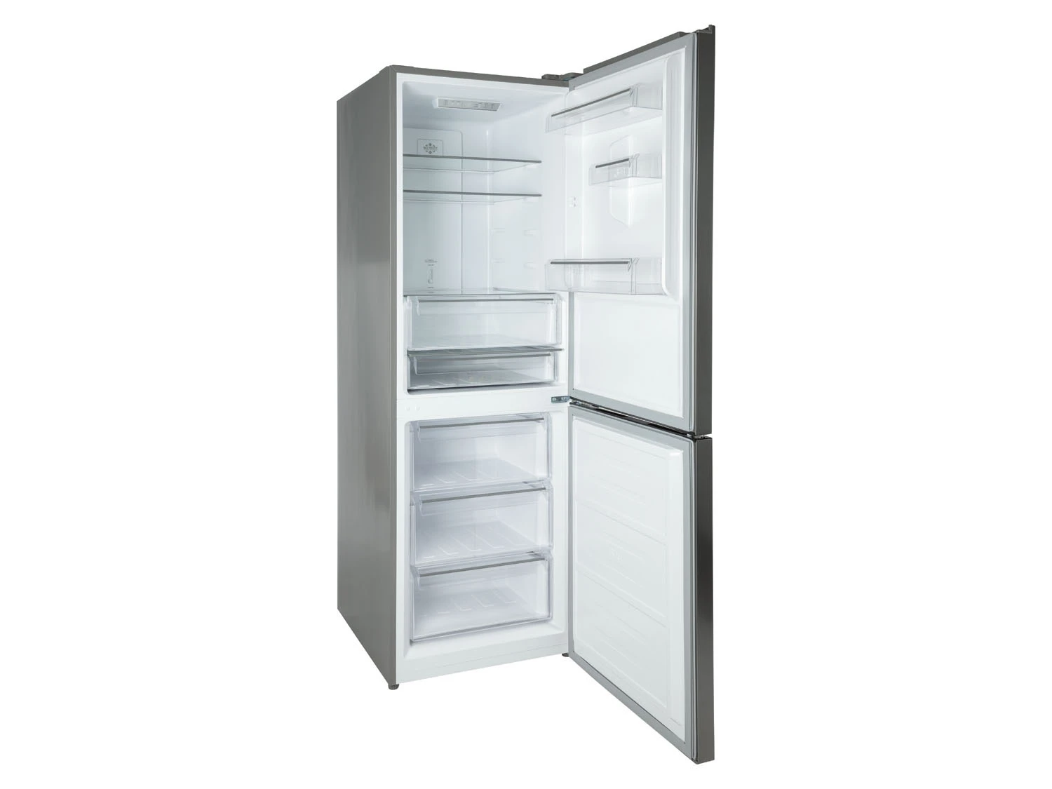 - Kühlteil: 2x höhenverstellbarer Glasboden, 1x transparente Gemüseschublade mit Glasabdeckung, 1x transparente Frischhalteschublade mit Glasabdeckung, 3x transparente Türablage
