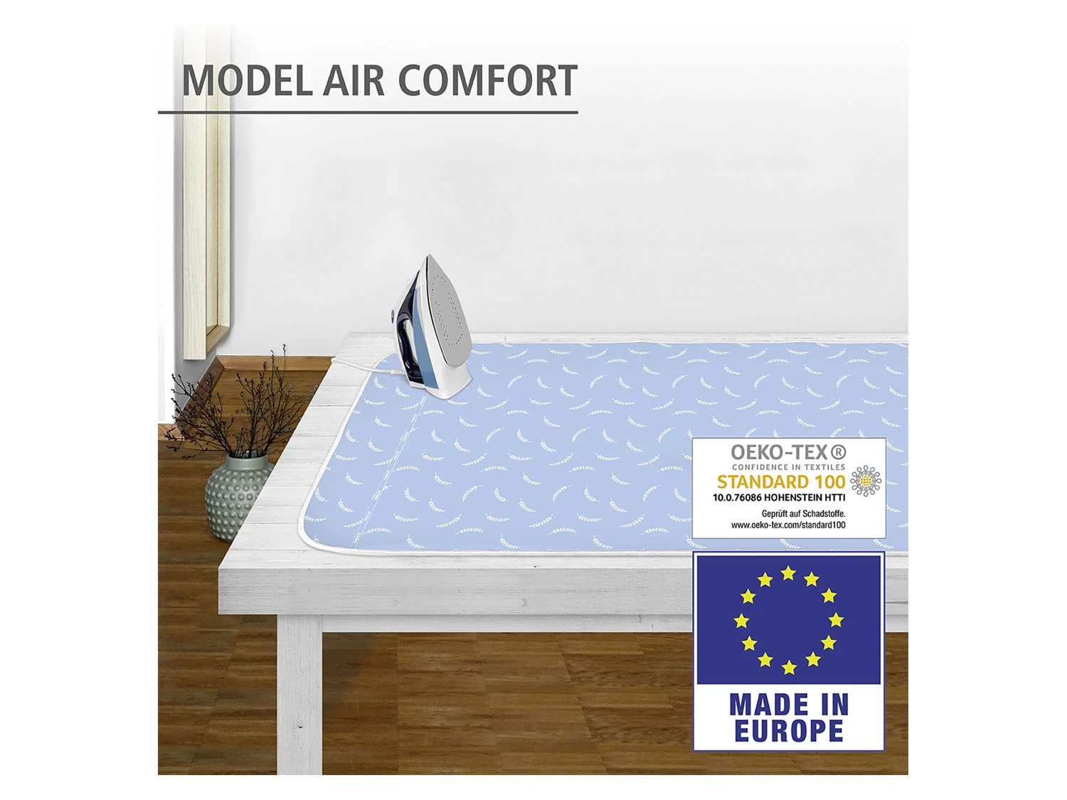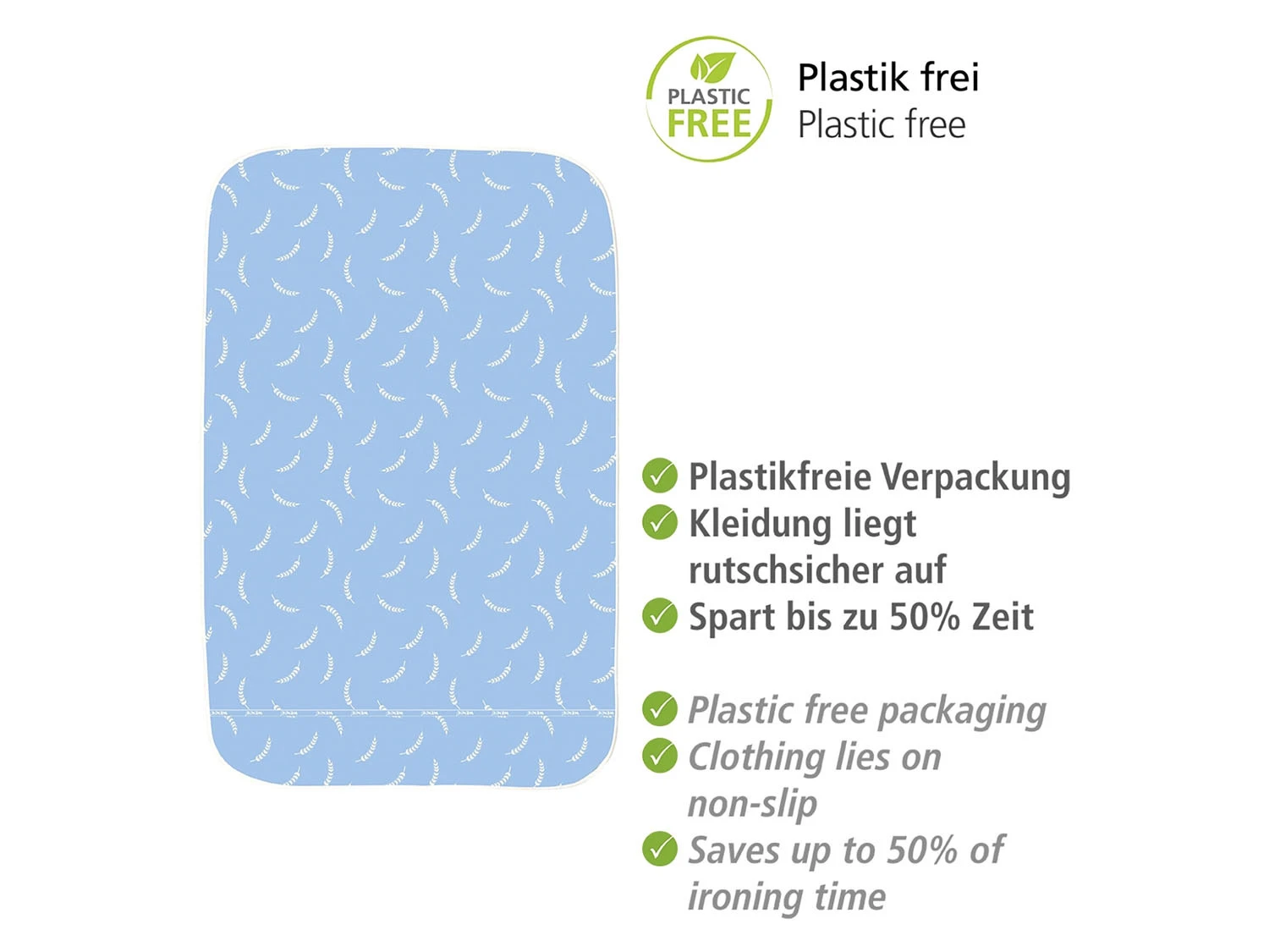 Die integrierte 3-fach Komfortpolsterung mit dicken Schaumstofflagen und Moltonpolster in Kombination mit der hitzereflektierenden Aluminiumschicht ermöglichen einen Gegenbügeleffekt, der Zeit und Strom spart.