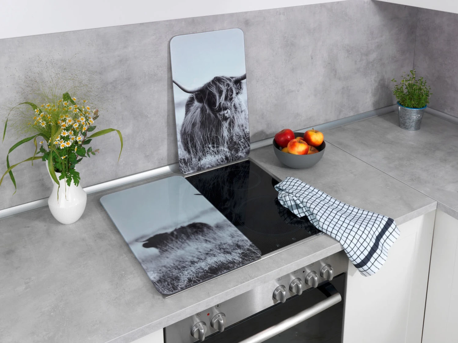 Mit den Herdabdeckplatten kommt bunte Vielfalt und Funktionalität in Einem in jede Küche. Die Abdeckplatten können dazu verschieden eingesetzt werden: Sei es als Arbeitsplatte oder Wandblende, als Schneidbretter oder mobile Arbeitsfläche. Zwei farbenfrohe Glasbretter sorgen für gute Laune.